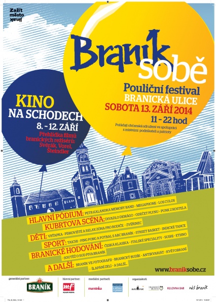 V sobotu 13. září 2014 promění Branickou ulici již potřetí pouliční festival Braník sobě. Na celý den odsud opět zmizí auta a místo nich vznikne místo na hraní a setkávání, zavoní domácí dobroty a na pódiích se bude hrát hudba a divadlo.